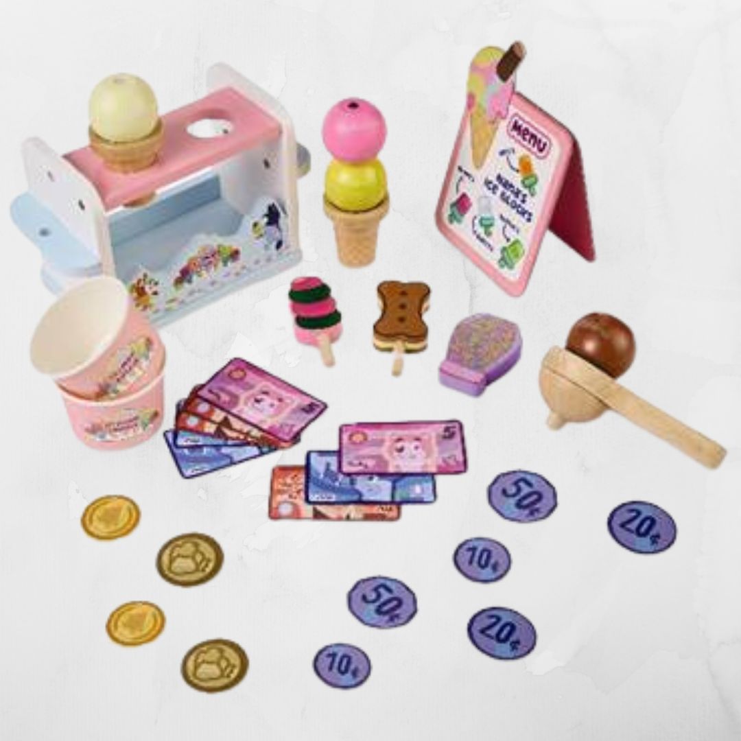 This great interactive set has so many parts to play with and so many lovely design features. 28 pieces including 1 x menu card, 1 x ice cream stand, 1 x ice cream scoop, 2 x ice cream cones, 4 ice cream balls, 2 x popsicles, 14 x money, 1 x sprinkles and 2 ice cream tubs.
