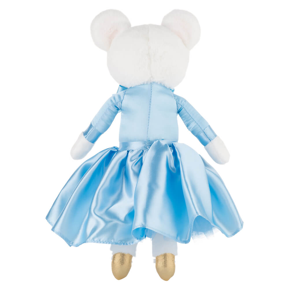 High-fashion meets hugs with this premium 30cm Claris the mouse plush toy dressed in a 'Très Belle Blue' gown, crafted from shiny satin and finished with an oversized bow around her neck.