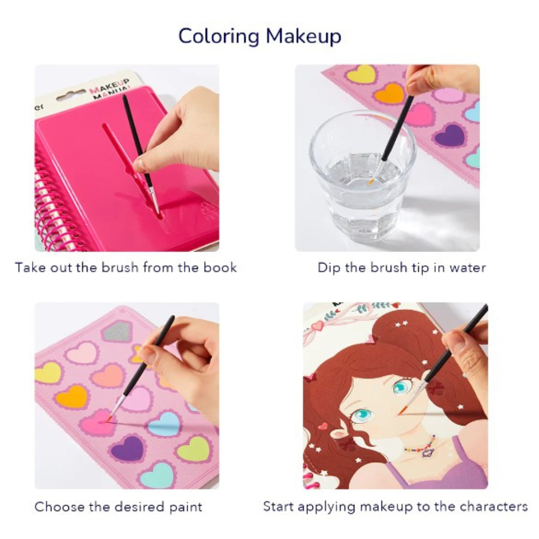 - Variety in Makeup Effects: Includes pages with shimmer and matte pigments, which are activated by water for easy application.