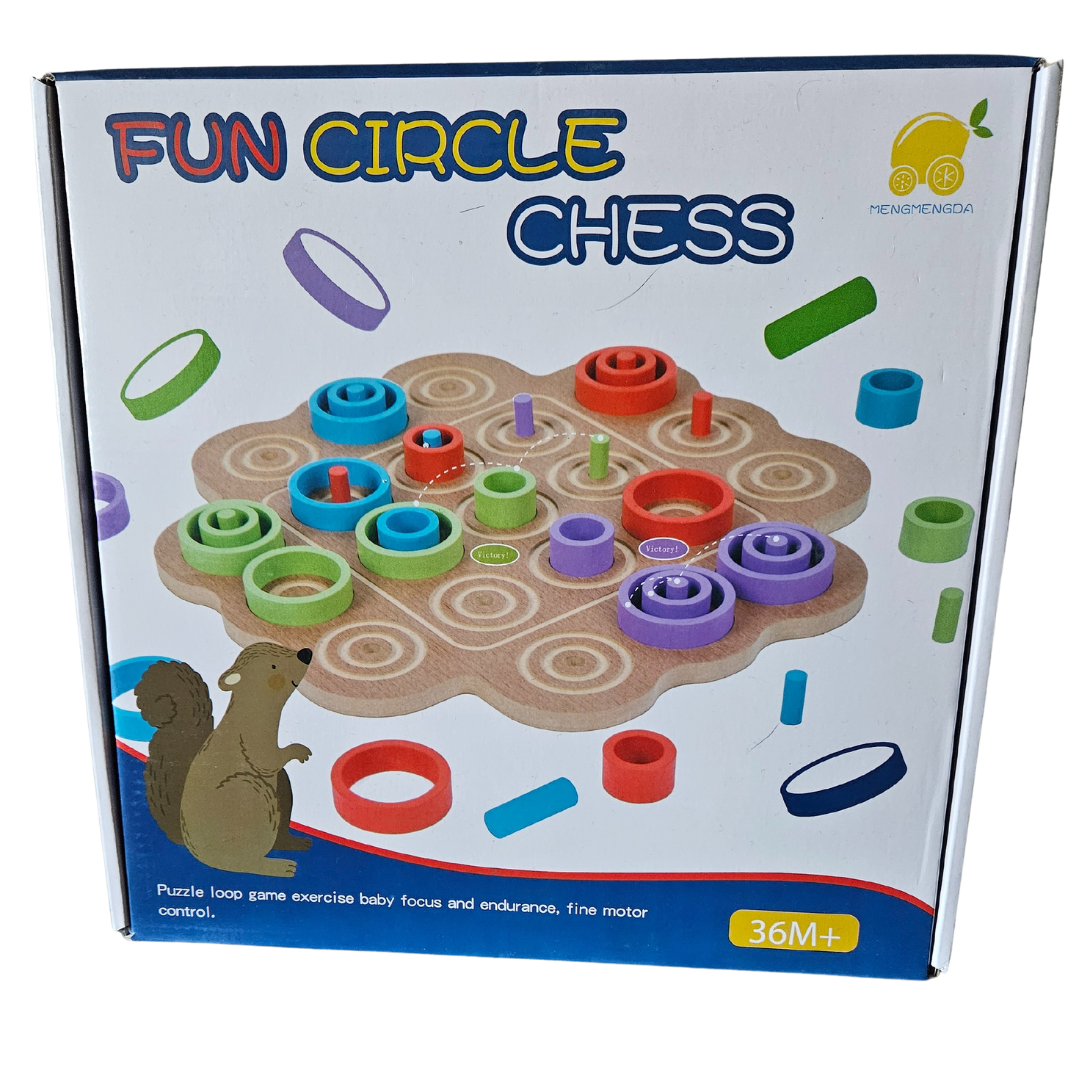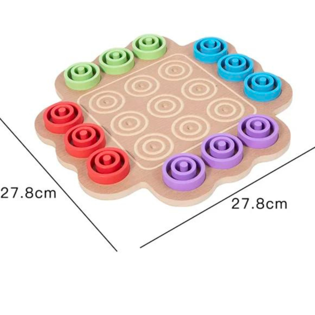 Players compete to line up three pieces of the same color my similar size; in ascending or descending order; or within the same space.