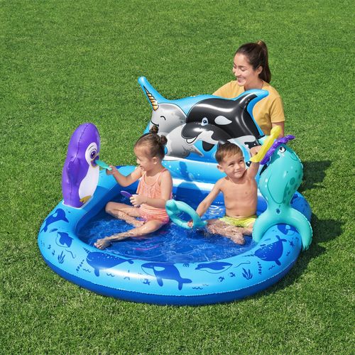 Featuring friendly arctic animals, the Polar Pals Play Center has a large play pool area, which includes an inflatable fish ring toss game with 2 possible targets.