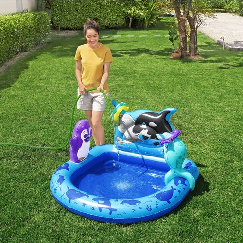 The Polar Pals Play Center is the perfect size for your front or backyard and can be easily set up by attaching it to the nearest garden hose.
