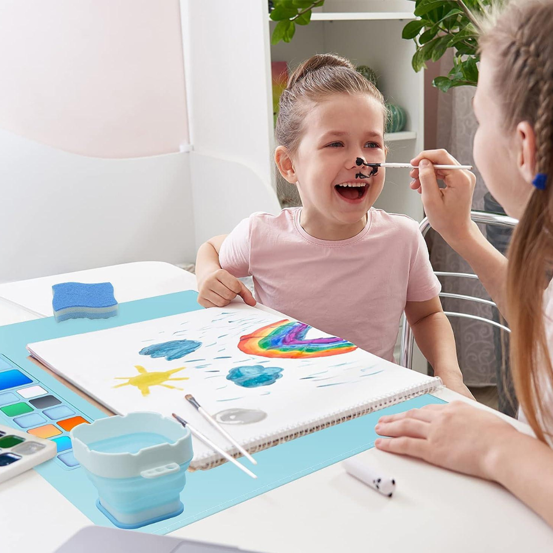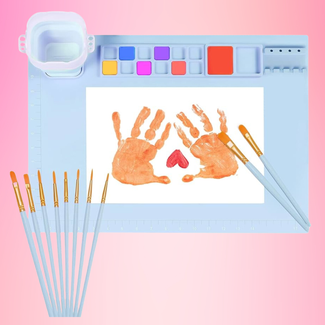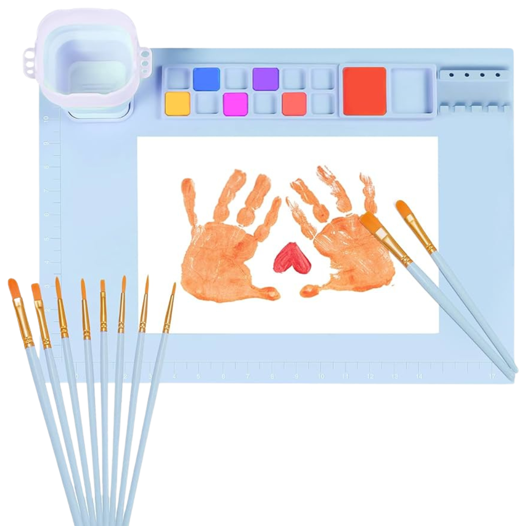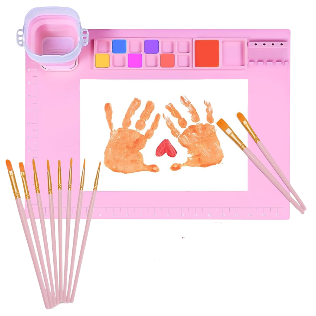 This silicone craft mat comes with a collapsible cleaning cup, small grids for paints, a set of paint brushes and a BONUS paint apron with arm guards for painting and all crafts.