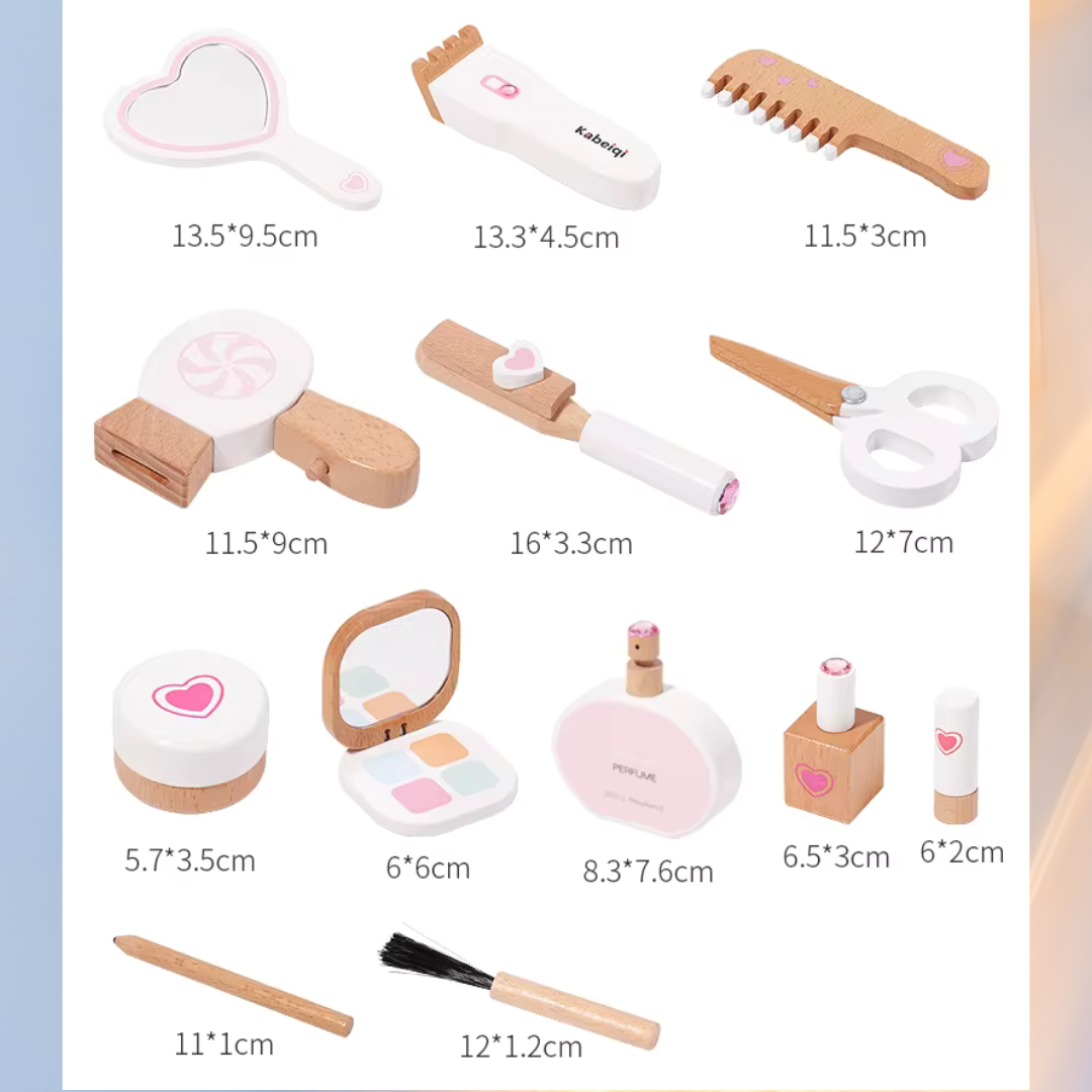 - A wooden blush, eyeshadow palette, perfume bottle, nail polish, lipstick, and makeup brushes for an authentic pretend makeup experience.